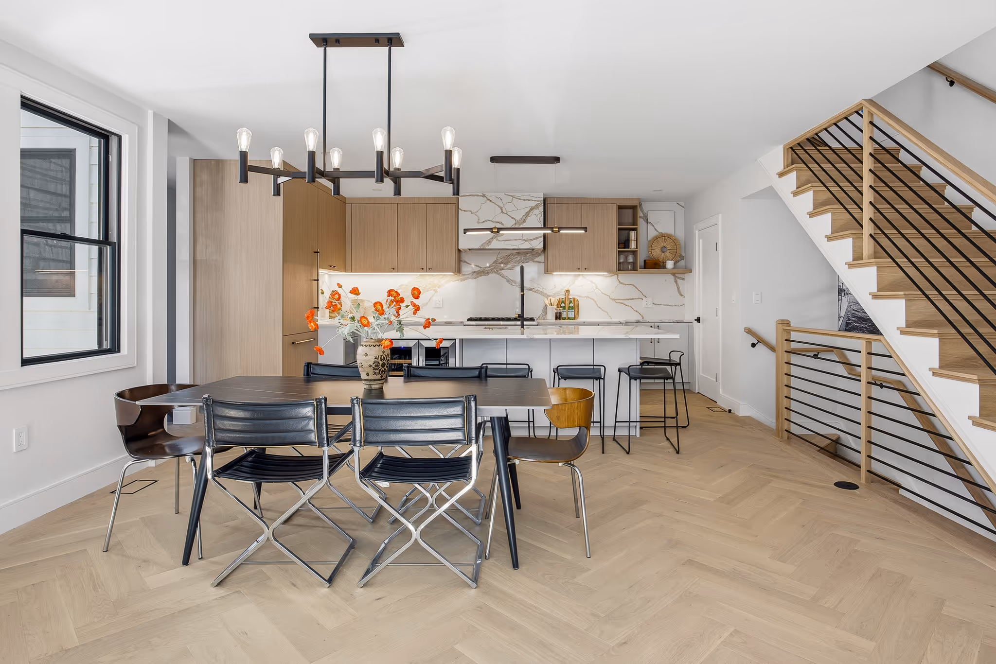 The home features high-end finishes, quartz surfaces, wood accents, and large windows that bring in strong natural daylight.